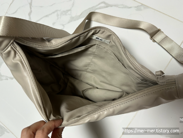 The bag's interior space is quite roomy, making it convenient to fit various items. Uniqlo's round mini shoulder bag also had excellent storage capacity, but this bag is larger than I expected. It can easily hold approximately two 500ml water bottles, as well as a phone, wallet, Airpods max, and many more items.